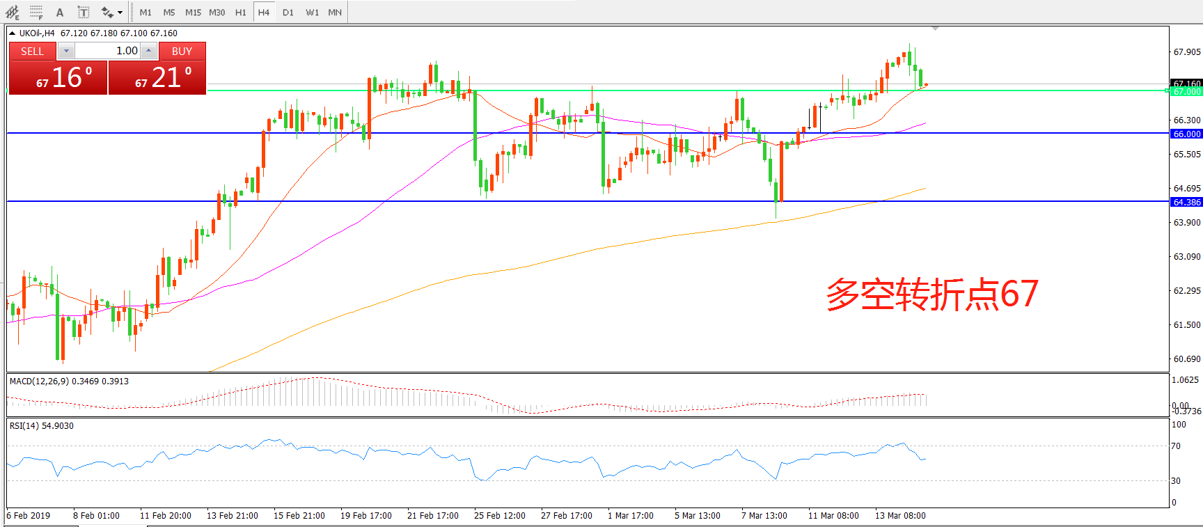 4小时图看,油价整体高位震荡后出现回落,但整体依然维持在67美金支撑之上,短期走势偏强,均线系统呈多头排列,MACD红柱增加,RSI指标有掉头迹象,日内宽幅震荡概率较大