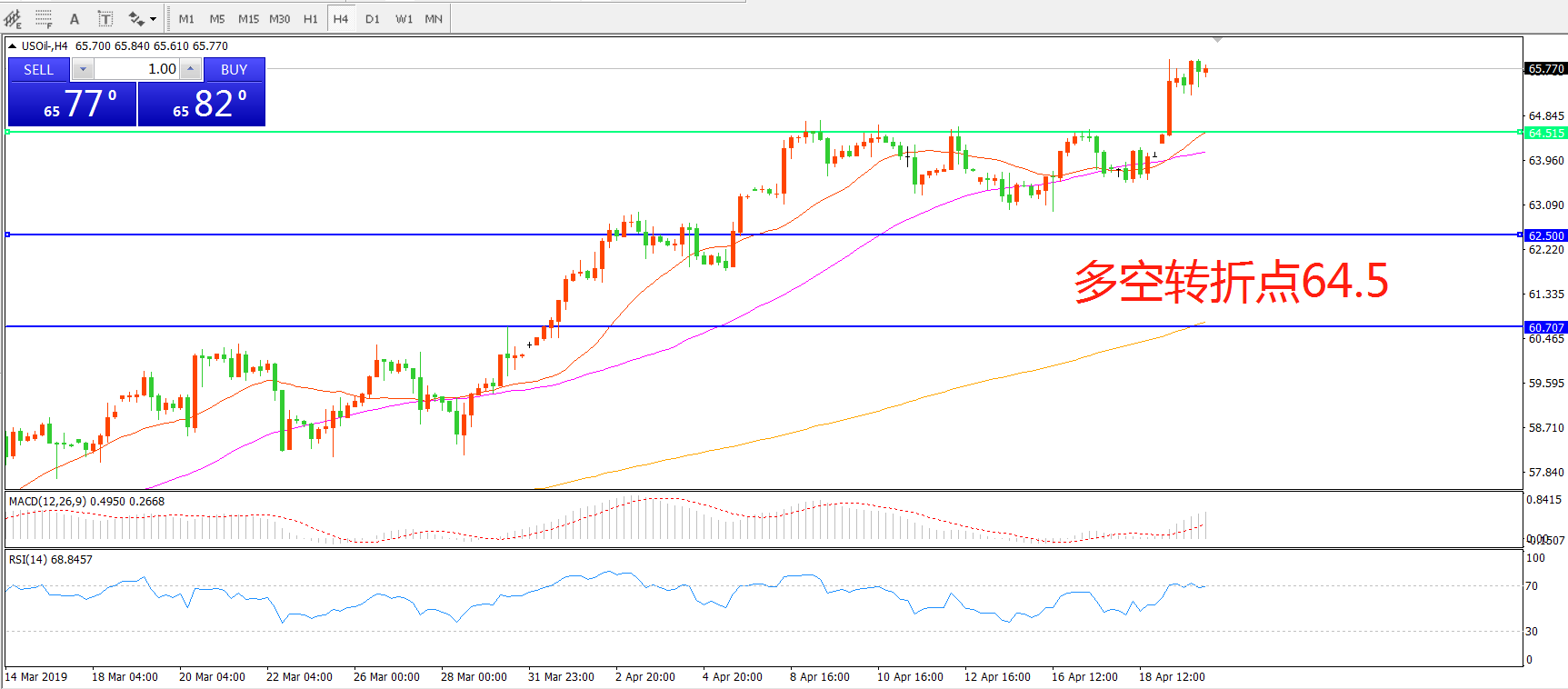 4小时图看,油价一柱擎天,强势突破前期阻力64.5,短期走势偏强,均线系统粘合形成下方支撑,MACD红柱增加,RSI指标走平,日内以多头思路为主。
