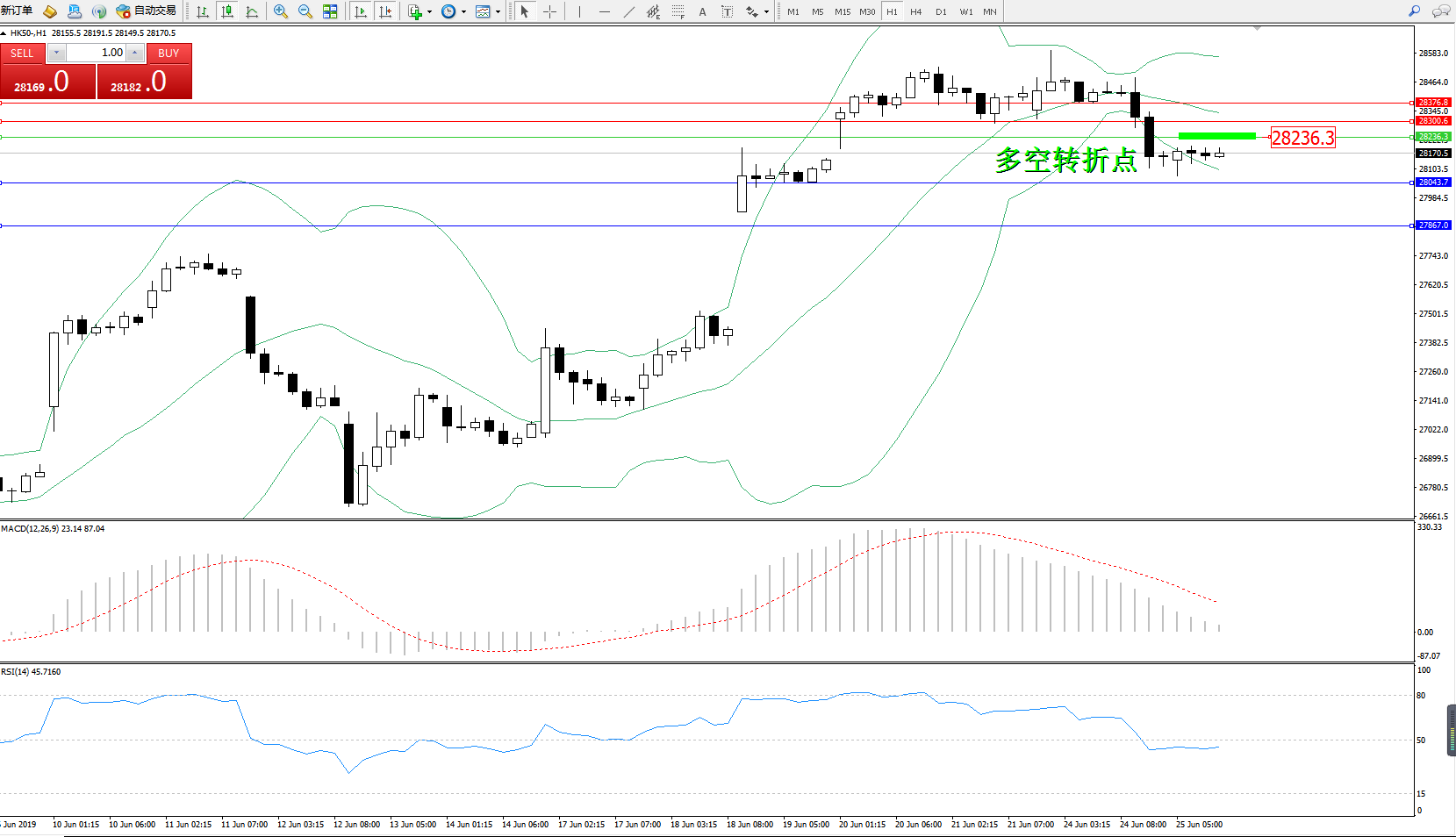 香港恒生指数6月25日(周二)收盘下跌327.02点,跌幅1.15%,报28185.98点;港股于6月第三周展开反弹,上涨幅度虽然较为理想,但当前难免有整固需求,本周如果能守住成果,7月的行情或会相对乐观。恒指短期处于回调阶段, 日内恒指震荡走低。港股冲高后弱势呈现再度回落,仅在窄幅区间波动,成交也见减少,外围及港股内部因素暂时缓解,令市场气氛改善,加上投资者憧憬美联储下月降息,港股短线或震荡整固消化前期涨幅。