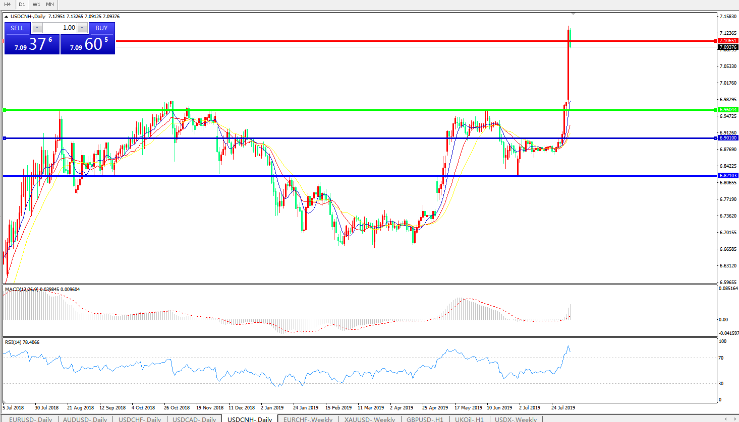 美元兑人民币USDCNH 日线图: