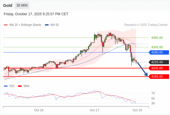 交易策略: 在 4280.00 之下,看跌,目标价位为 4205.00 ,然后为 4165.00 。