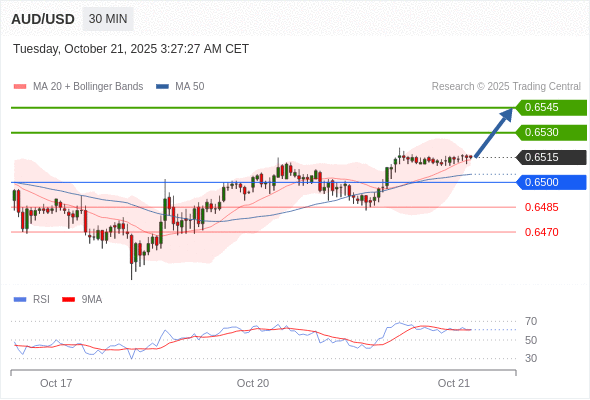 在 0.6500 之上,看涨,目标价位为 0.6530 ,然后为 0.6545 。