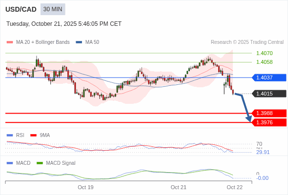 美元/加元 当日内 : 看跌,在 1.4037 之下。
