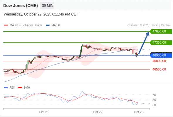 在 46960.00 之上,看涨,目标价位为 47330.00 ,然后为 47650.00 。