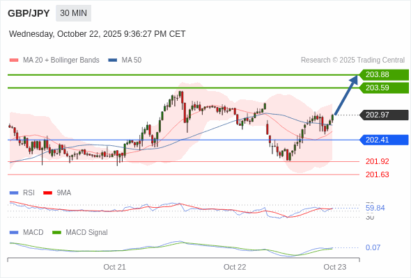 英镑/日元 当日内 : 看涨,当 202.41 为支撑位。
