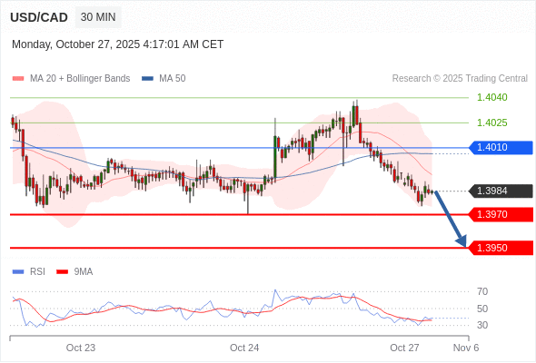 在 1.4010 之下,看跌,目标价位为 1.3970 ,然后为 1.3950 。