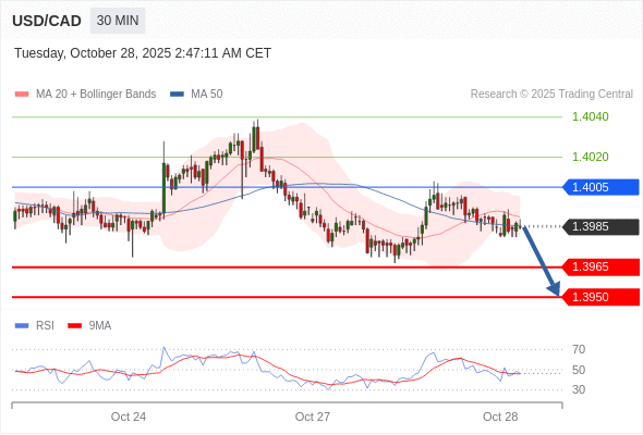 在 1.4005 之下,看跌,目标价位为 1.3965 ,然后为 1.3950 。