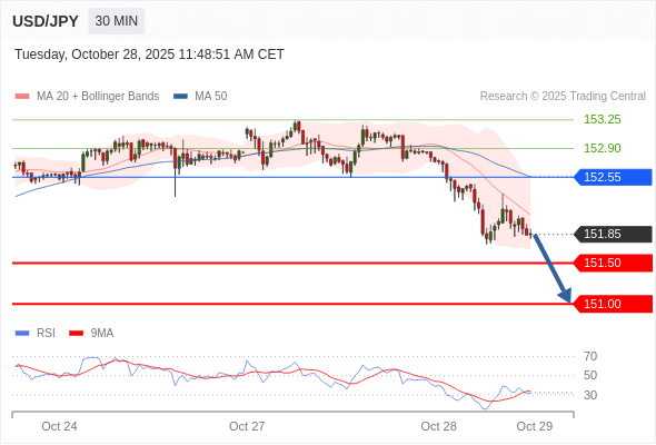 在 152.55 之下,看跌,目标价位为 151.50 ,然后为 151.00 。