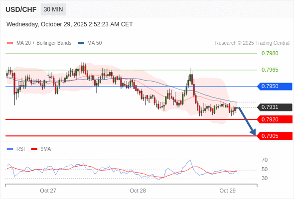 在 0.7950 之下,看跌,目标价位为 0.7920 ,然后为 0.7905 。
