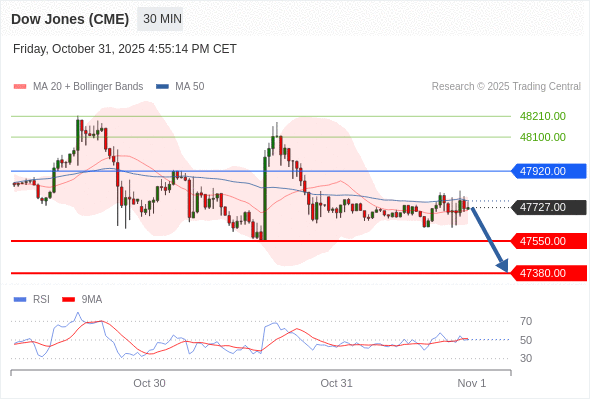 交易策略: 在 47920.00 之下,看跌,目标价位为 47550.00 ,然后为 47380.00 。