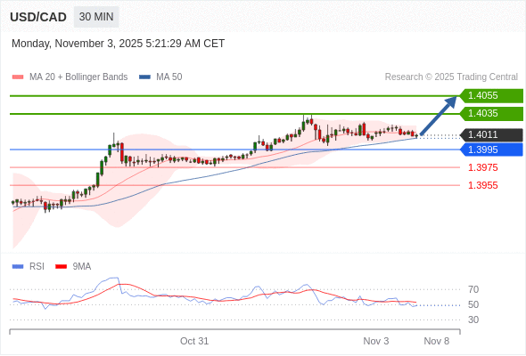 在 1.3995 之上,看涨,目标价位为 1.4035 ,然后为 1.4055 。