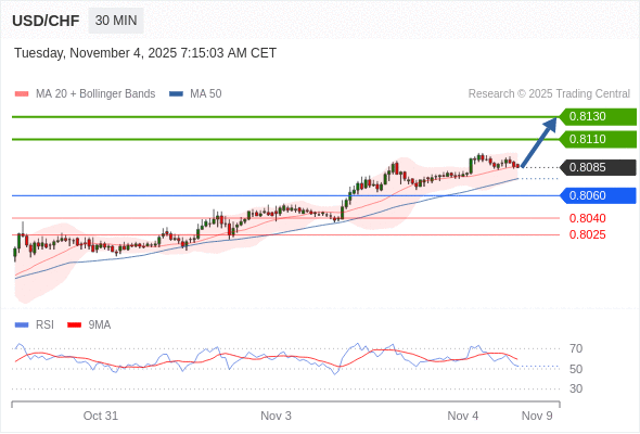 在 0.8060 之上,看涨,目标价位为 0.8110 ,然后为 0.8130 。