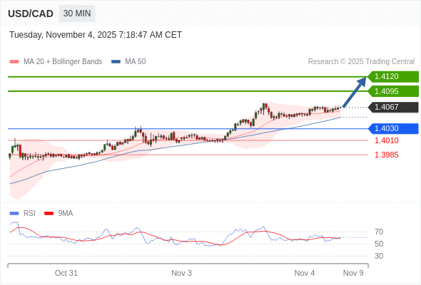 在 1.4030 之上,看涨,目标价位为 1.4095 ,然后为 1.4120 。