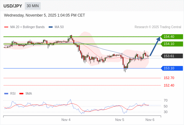在 153.10 之上,看涨,目标价位为 154.10 ,然后为 154.40 。