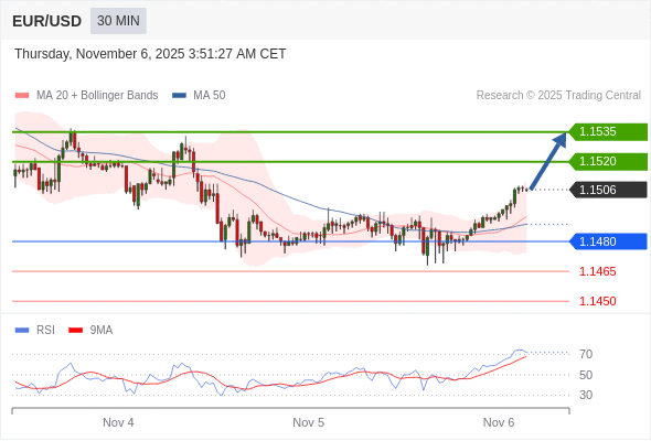 在 1.1480 之上,看涨,目标价位为 1.1520 ,然后为 1.1535 。