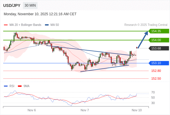 在 153.10 之上,看涨,目标价位为 154.00 ,然后为 154.35 。