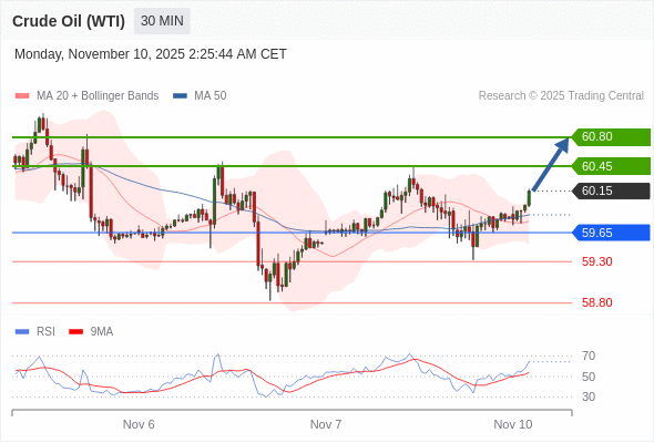 在 59.65 之上,看涨,目标价位为 60.45 ,然后为 60.80 。