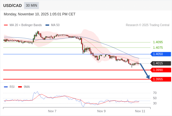 在 1.4050 之下,看跌,目标价位为 1.3990 ,然后为 1.3955 。