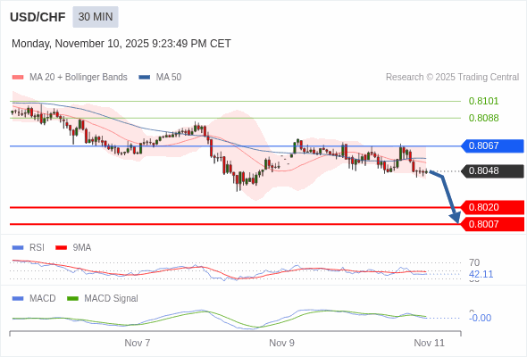 美元/瑞郎 当日内 : 看跌,在 0.8067 之下。