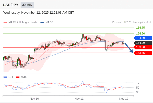 交易策略: 在 154.30 之下,看跌,目标价位为 153.90 ,然后为 153.65 。