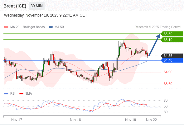 在 64.40 之上,看涨,目标价位为 65.10 ,然后为 65.30 。