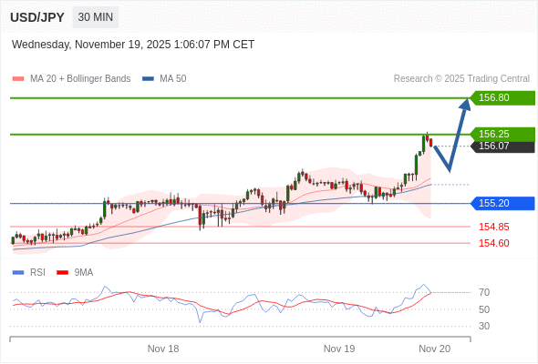 在 155.20 之上,看涨,目标价位为 156.25 ,然后为 156.80 。