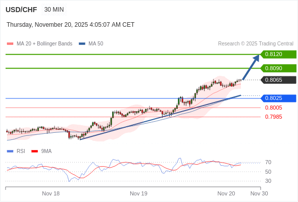 在 0.8025 之上,看涨,目标价位为 0.8090 ,然后为 0.8120 。