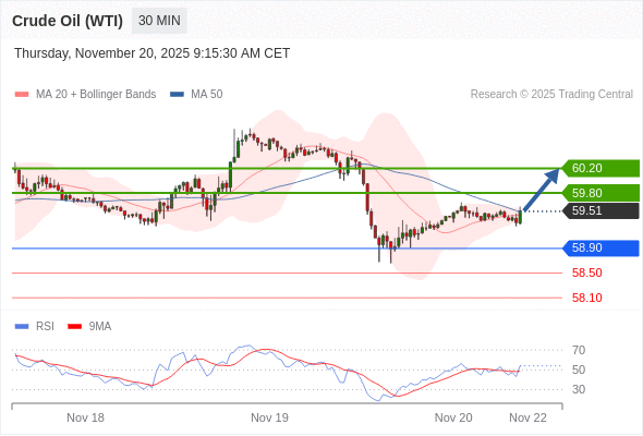 在 58.90 之上,看涨,目标价位为 59.80 ,然后为 60.20 。