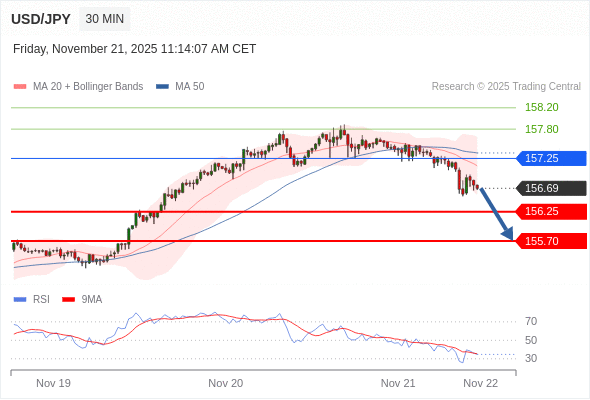 交易策略: 在 157.25 之下,看跌,目标价位为 156.25 ,然后为 155.70 。