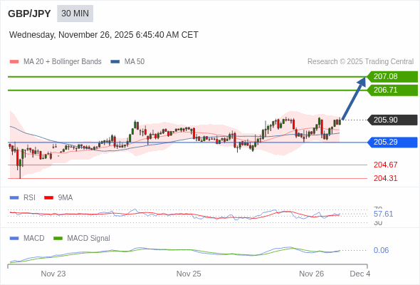 英镑/日元 当日内 : 看涨,当 205.29 为支撑位。