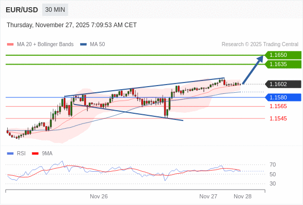 在 1.1580 之上,看涨,目标价位为 1.1635 ,然后为 1.1650 。