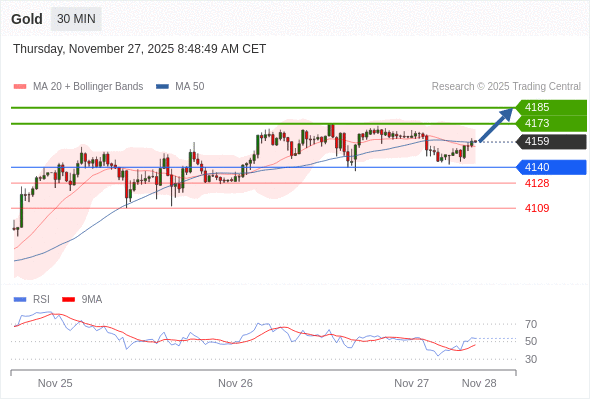 在 4140 之上,看涨,目标价位为 4173 ,然后为 4185 。