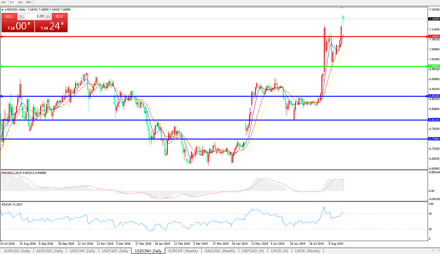 技术面简析:日图均线再度呈有序多头排列,汇价高位维持强势,MACD运行在0轴上方且动能有再度放量迹象,RSI再度升入超买区域,预计汇价将维持攻势,重点关注7.20-7.30区间的压制;中美贸易战升级,短期汇价波动率急剧上升。