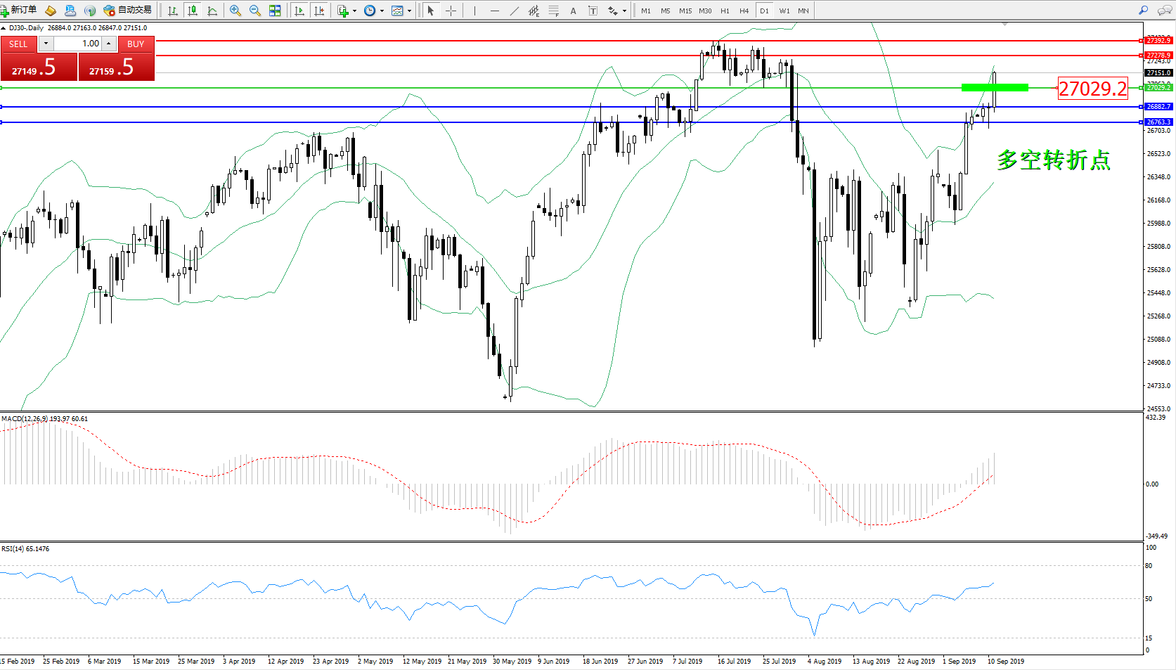 道琼斯指数9月11日(周三)收盘上涨227.60点,涨幅0.85%,报27137.04点。因市场预期主要央行将放松货币政策,而全球经济增长风险持续,尽管近期经济指标可能促使美联储降息25个基点,但TIAA Bank表示,没有必要大幅降息50个基点;贸易局势的进展及中国数据的好转也提振了全球股市,美国总统特朗普:美联储应该降息至零甚至负利率,美国应该开始为债务再融资,美国应该始终支付最低利率。