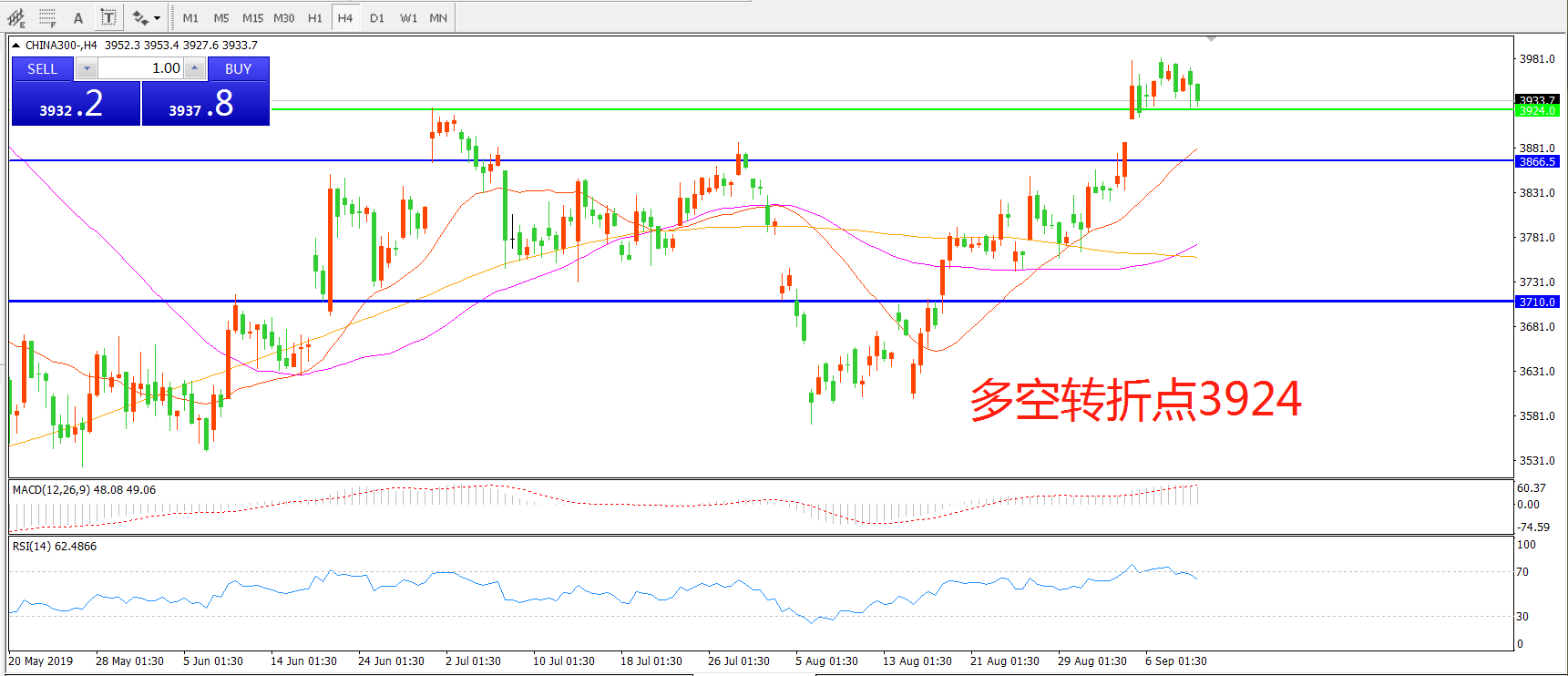 4小时图看,沪深300高开低走,短暂回踩3924支撑后,整体走势依然偏强,均线系统呈多头排列,MACD红柱增加,RSI指标走平,日内延续上行概率较大。
