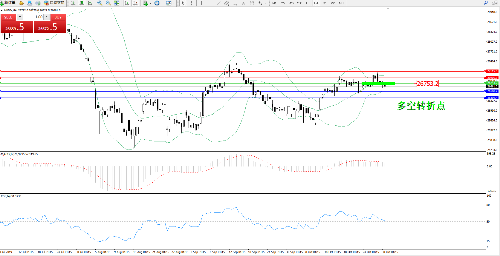 香港恒生指数10月30日(周三)收盘下跌119.05点,跌幅0.44%,报26667.71点;港股小幅低开后曾反弹倒升22点。唯高位见沽压,再回落倒跌,并逐步扩大跌幅,恒指最触及26625。A股三大股指今日集体回踩,盘中蓝筹板块持续疲弱,加上热点区块链概念股尾盘出现分化严重。外围市场整体走势偏弱,美股还需密切跟踪苹果的财报。最近该公司股价一路高歌猛进,屡创新高,但昨日的下跌是否会形成趋势反转也需要注意。