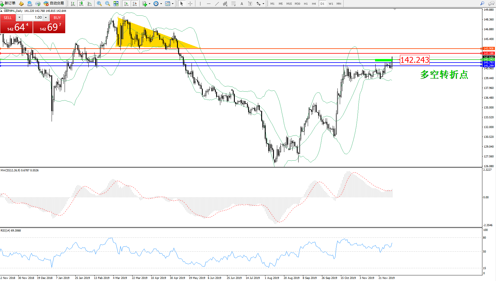 技术点评:多头动力突破持续数日的震荡整理区间,开始缓慢上行中,且延续布林带指标中上轨区间不断拉升中,MACD指标多头区域维持整理走势中,RSI指标处于多头区域不断震荡上行中;