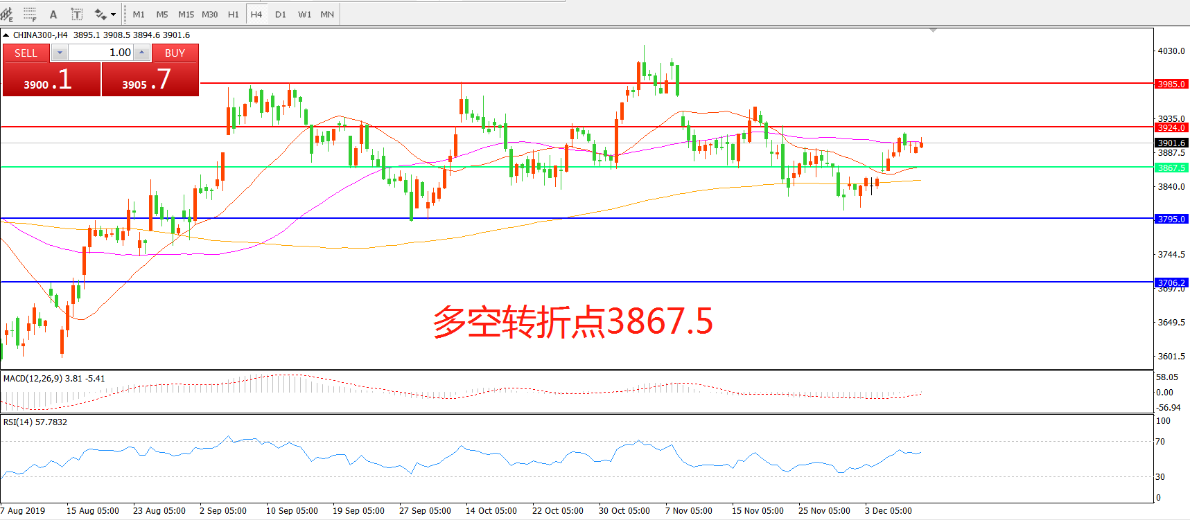 4小时图看,沪深300阳线维持窄幅震荡,整体走势有所回暖,均线系统走平,MACD绿柱缩短,红柱增加,RSI指标向上,日内震荡上行概率较大。