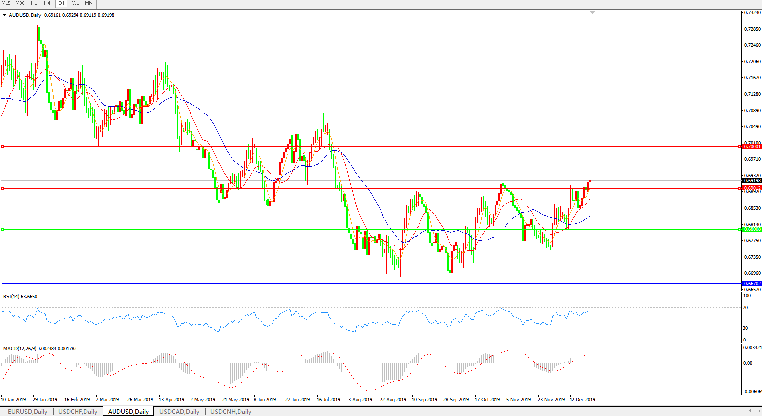澳元兑美元在周一延续强势,有望连续第四个交易日收高,并最终实现上破站稳200日均线的目标。澳元汇价近期继续强势,主要受到全球贸易局势趋于缓和,同时各主要经济体仍有望在2020年进一步推行经济刺激措施,这对出口原材料的澳洲经济前景构成持续利多,令其领涨非美货币;澳元兑美元日内因而重新升破0.69关口,并站上200日均线切入位,若能在日内收盘守住0.6904这一点位,则中期走势反转可期,下一步阻力目标在前期高点0.6939。鉴于自2018年4月以来澳元兑美元汇价从未在日线收盘站稳于200日均线上方,这一突破配合上更多贸易领域基本面利多消息,将推动澳元在来年打开更大的反弹空间。