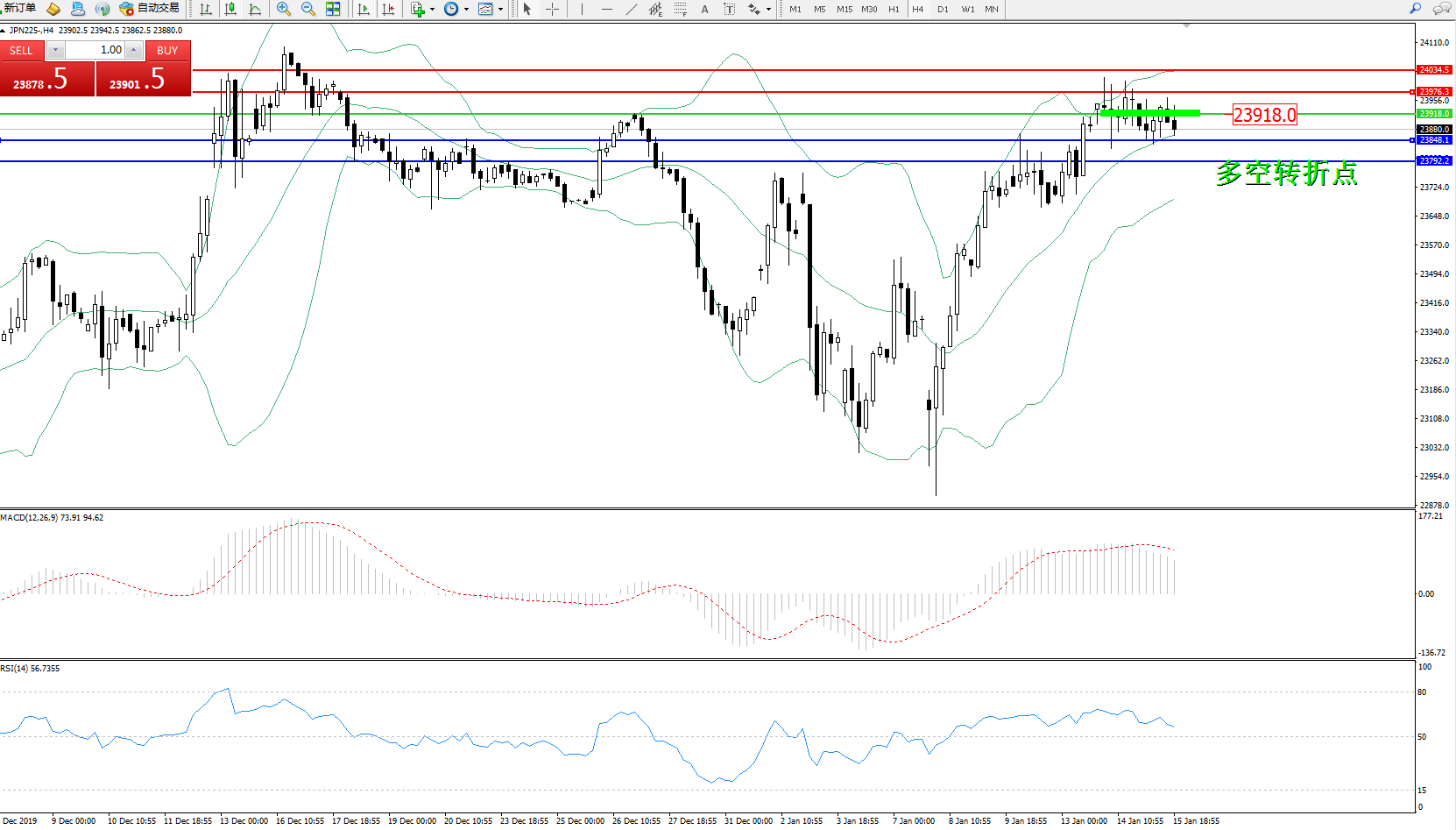 日经225指数1月15日(周三)收盘下跌124.67点,跌幅0.52%,报23900.50点。日本央行行长黑田东彦:日本经济处于温和扩张趋势中,如果风险上行,央行会毫不犹豫增加宽松措施,如有需要,预计短期和长期利率将维持在当前或更低水平至足够长的时间,消费者通胀将逐渐朝2%加速,因正面产出缺口和通胀预期上升、与此同时会暂受油价下滑影响,为实现2%通胀目标,日本央行将以收益率曲线控制维持量化质化宽松(QQE),日本央行将继续扩大基础货币直到消费者通胀稳定超过2%。