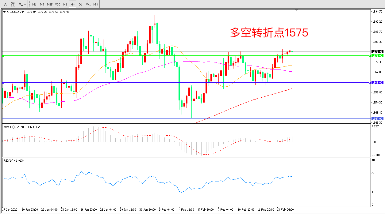 4小时图看,金价震荡走高突破1575一线上行动力较强,均线系统走平, MACD红柱增加RSI指标走平日内延续上行概率较大。