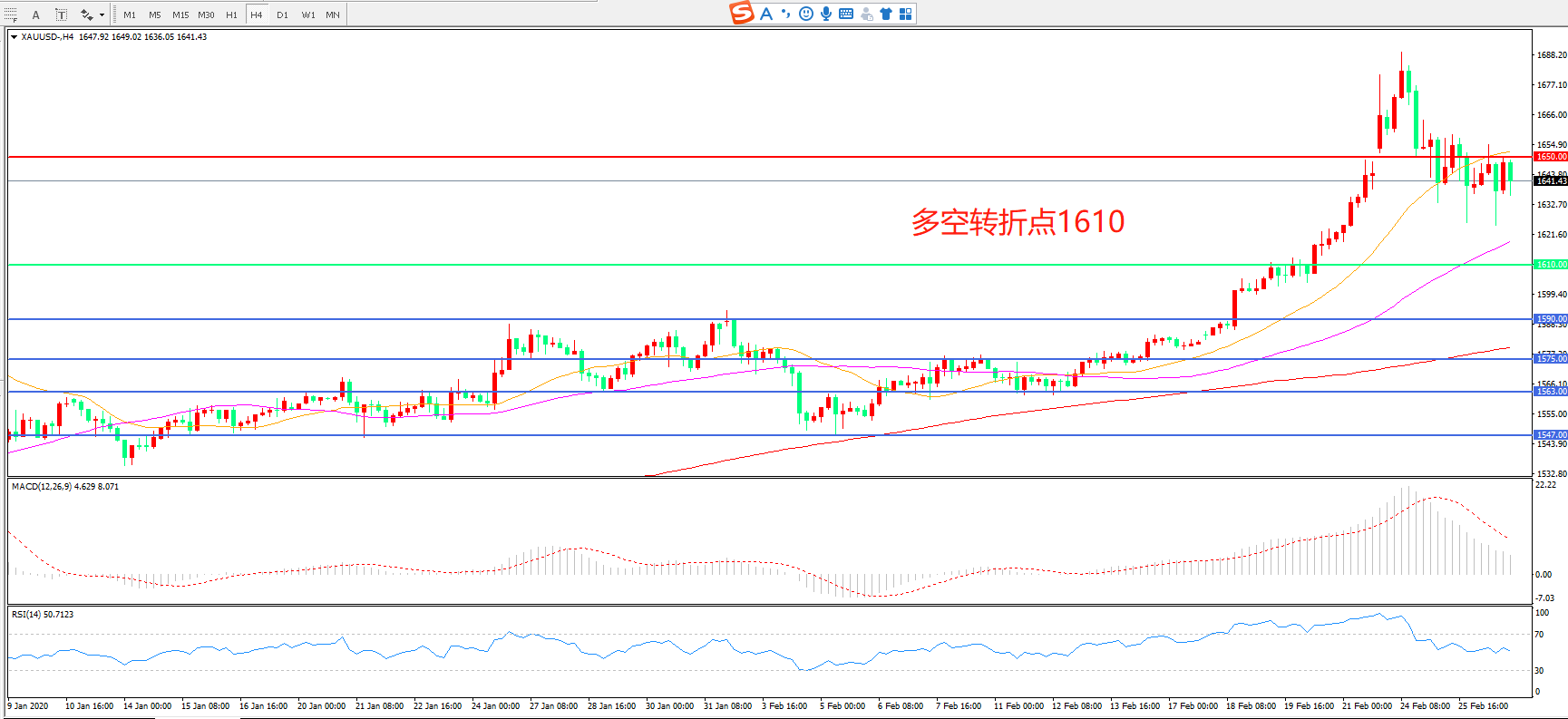 4小时图看,金价近期延续高位震荡,1650成为短期阻力,均线系统呈多头排列, MACD红柱缩短,RSI指标下行,日内延续震荡概率较大。