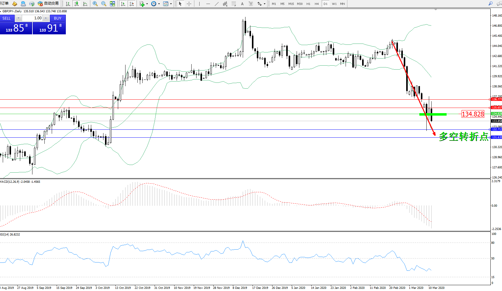 交易策略:134.828下方看跌,目标132.713、131.635
