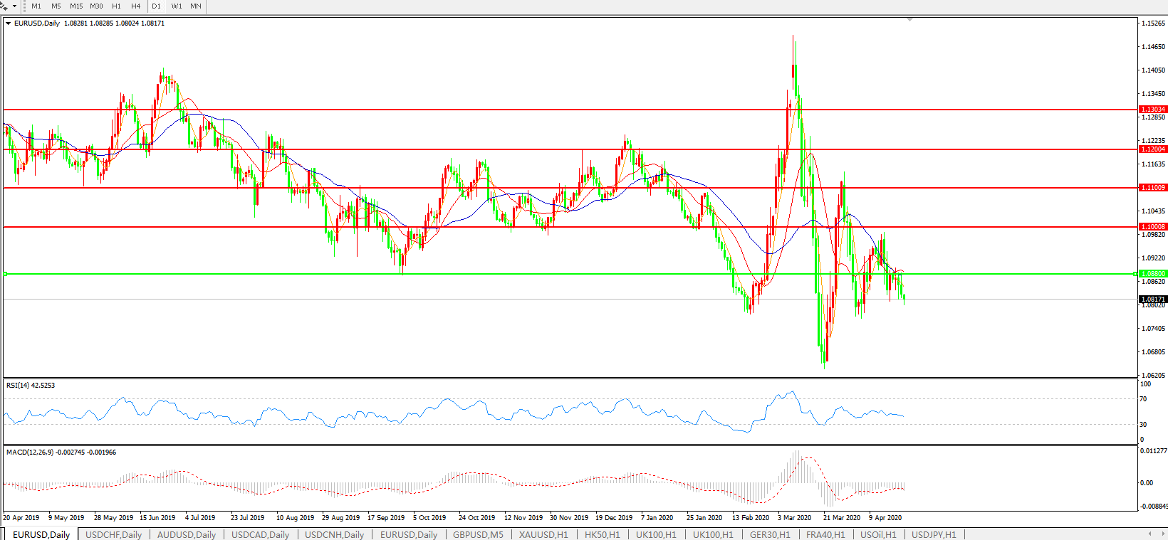 欧元兑美元周四延续隔夜弱势,最低触及1.0805,逼近隔夜触及的两周低位1.0803,路透调查显示欧元区经济料出现有史以来最严重衰退,对欧元拖累明显;德国将采取更多措施来保护经济免遭新冠疫情的影响;欧盟领导人将采取行动,为疫情后的经济复苏提供联合融资,但目前内部分歧较大;技术面动能指标,5、10和21日移动均线小幅走低,格局倾向负面;可能测试1.0756-69支撑位,这是3月反弹的76.4%回档位和4月低点;4月低点1.0760和稍早高位1.0825为初步支撑和阻力位;1.0750有10亿、1.0790-1.0800有14亿、1.0815-25有6.5亿、1.0840-50有12亿期权到期。