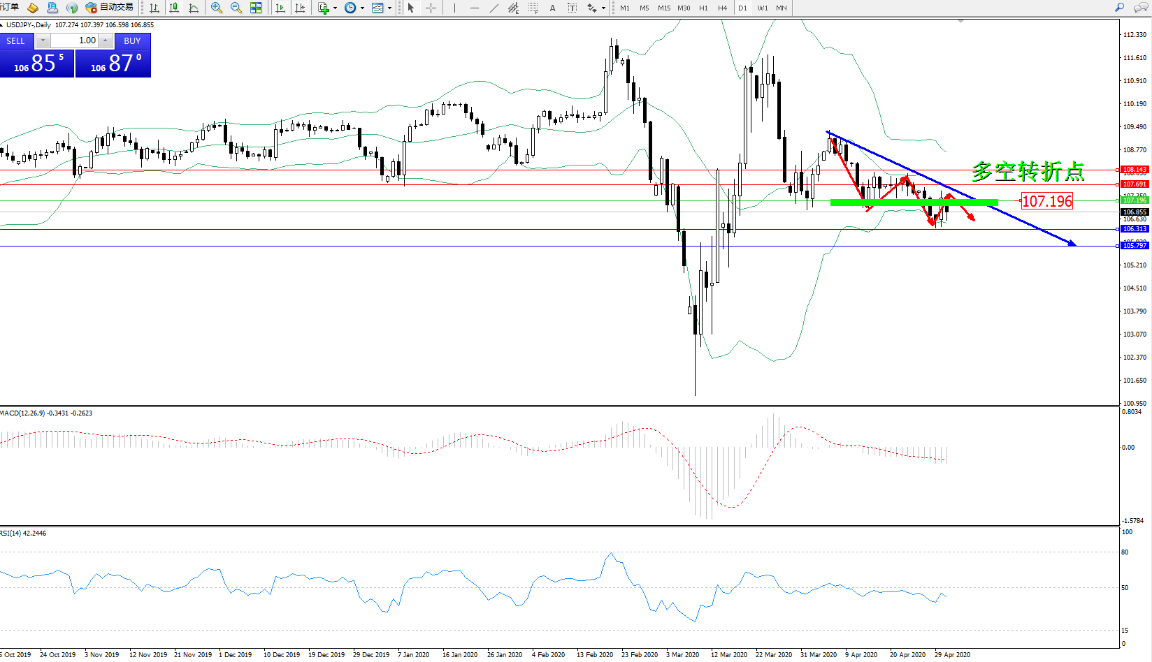 交易策略:107.196下方看跌,目标106.313、105.797