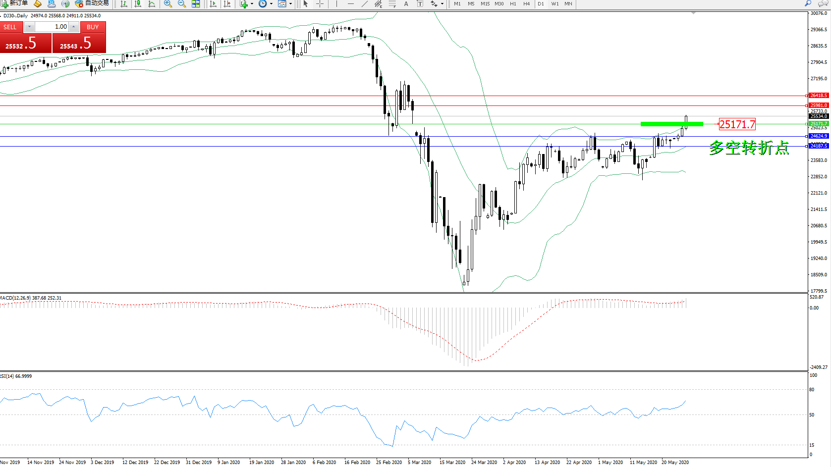 道琼斯指数5月27日(周三)收盘上涨553.20点,涨幅2.21%,报25548.27点。美股集体收涨,金融板块涨幅居前。美联储最新公布的褐皮书报告称,新冠疫情在最近几周严重损害了美国经济,造成“严重”的失业和企业倒闭情况;经济复苏的前景需要一段时间,美联储官员保持宽松政策的可能性也很大,所有区域经济活动均出现下降,且大多数区域急剧下降,反映出新冠疫情造成的破坏。贸易方面的消息已经传出,但由于市场人气仍高企,安全资产并没有从中获得任何好处。随着经济的重新开放提振了乐观情绪,提高了投资者对风险较高资产的兴趣,贸易局势问题已退居次要地位。
