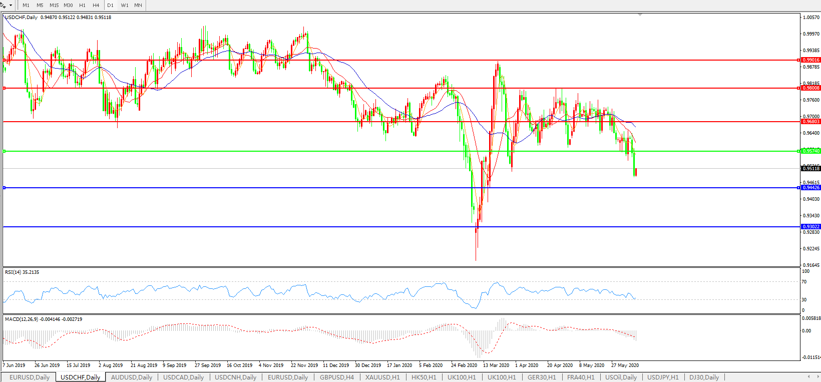交易策略:0.9575下方看跌,目标0.9440、0.9300