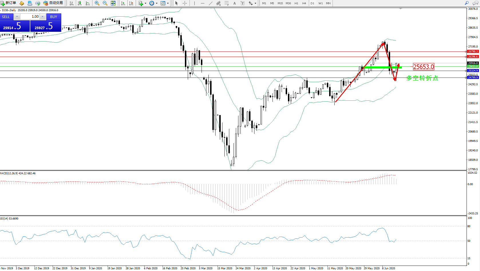 技术点评:空头动力高位急速震荡回撤下破布林带指标中轨后进入中下轨开始震荡,低位得到短期支撑,多头动力伺机入场,开始反扑,回升至中轨附近弱势徘徊中,布林带指标呈收口走势中,MACD指标处于0轴线上方多头区域弱势整理下移中,RSI指标处于空头动力急速下挫至50均衡线附近弱势徘徊中;