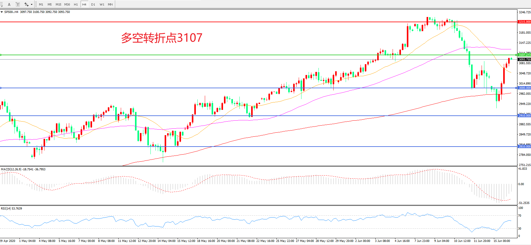 4小时图看,标普500回踩200周期均线后大幅反弹,短期表现有所回暖,但整体上仍处于下降区间,MACD绿柱缩短,RSI指标走平,日内可能有小幅反弹,但整体走势偏空。