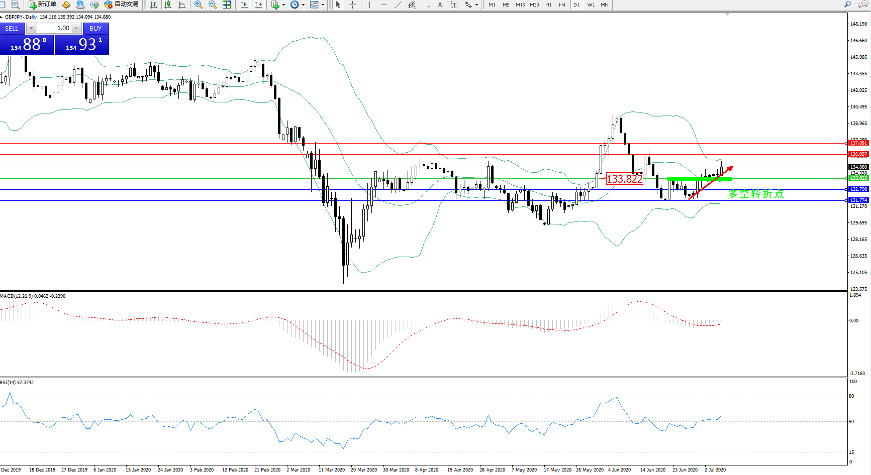 交易策略:133.822上方看涨,目标136.057137.081